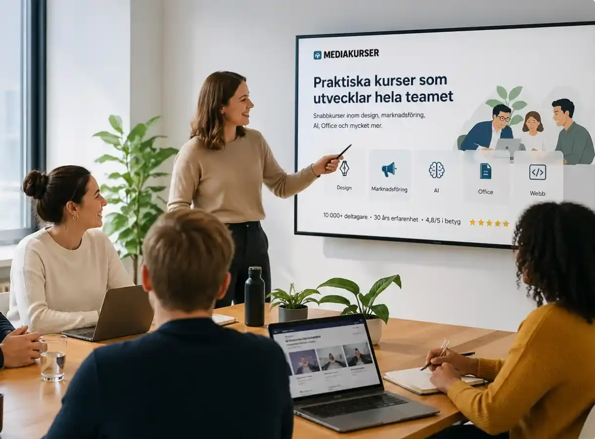 Ge hela teamet tillgång till praktiska snabbkurser inom design, marknadsföring, AI och Office. Perfekt för kompetensutveckling utan att stoppa verksamheten.